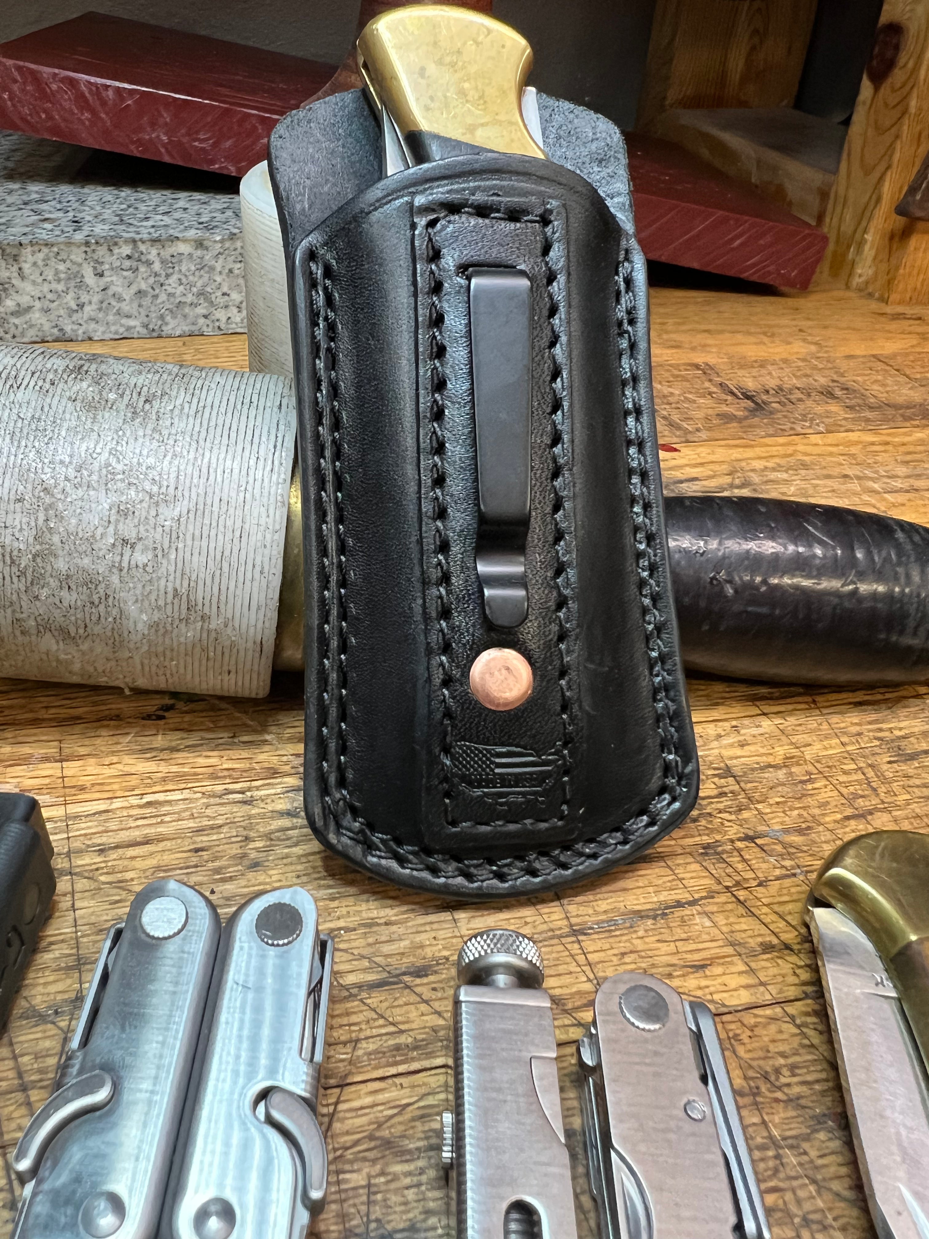 FDL Custom Made Multi-tool Cases are all handmade by FDL from premium Veg-tanned Leather and are built to last. Why dig around your pockets or try to get to your Multi-tool or Knife while your gear is on when you can have it readily available on your Hip. The design of a Pancake case keeps it tight and secure on your hip..
