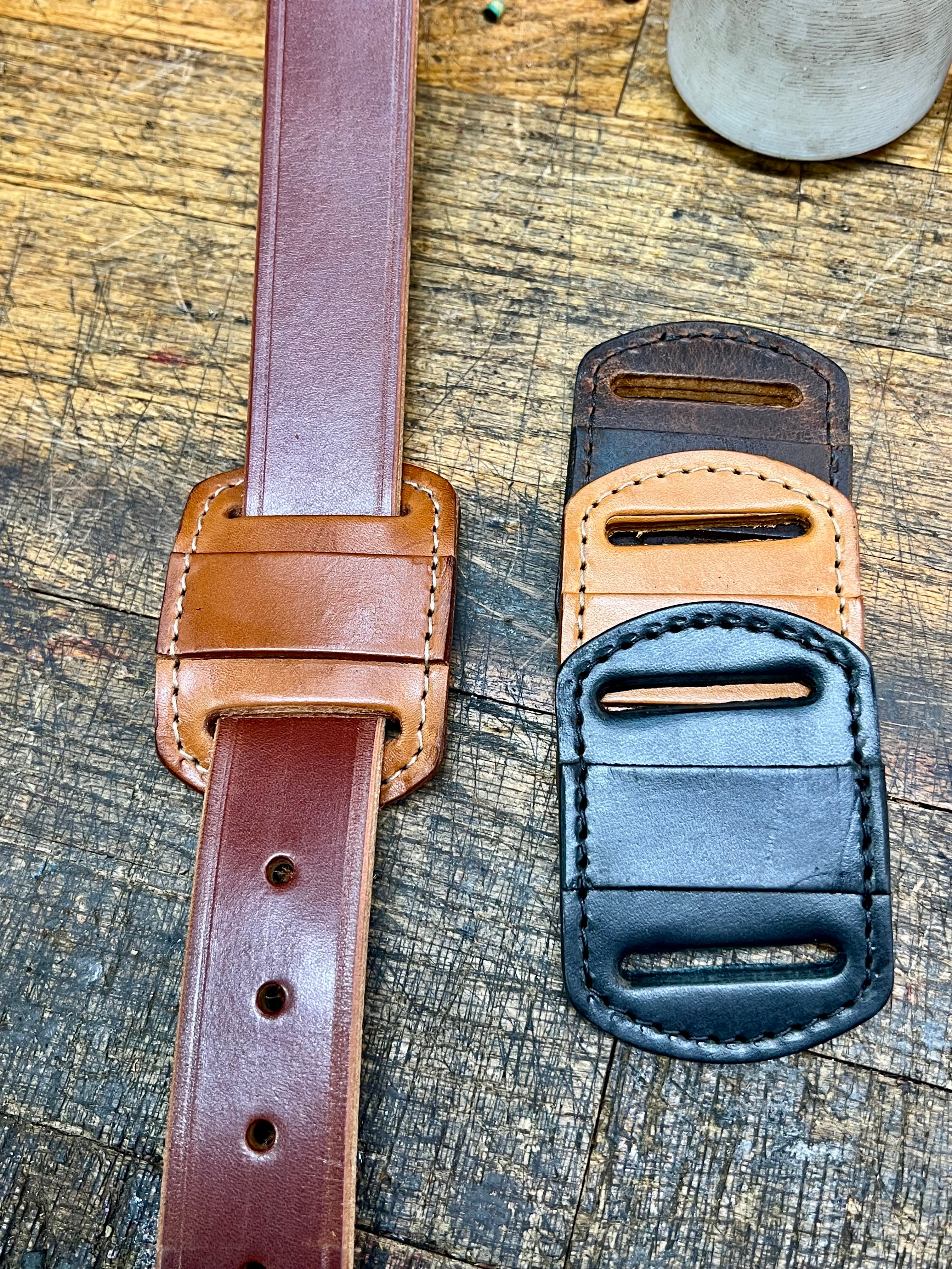 Each Hanger is made with top quality Herman Oak Veg Tanned Leather and the Leather is doubled up and is worn in a Pancake Style on your strap , it is compact and takes up very little room.